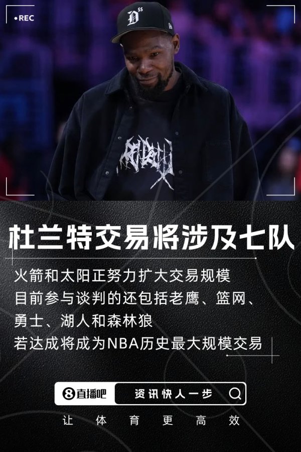07月03日讯 据TA记者Fred Katz报谈,杜兰特交游现在还未弘扬罢了,讯息东谈主士显现,火箭和太阳正辛勤将杜兰特的交游扩大到创NBA记载的七队大交游。
