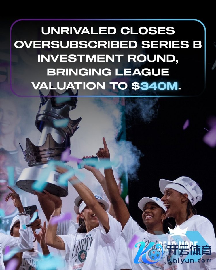 9月8日讯 WNBA球星、好意思国女篮球员斯图尔特和科利尔等东谈主共同创办的新联赛Unrivaled,是由6队以为30名球员构成的一个3v3和1v1篮球赛事,旨在WNBA休赛期能让球员们在原土打第二份工、无用奔走于外洋联赛。在本年的岁首,联赛还是完成了第一个赛季。 2024年12月,该联赛的估值为3500万好意思元世界杯体育信息,而9个月后的今天,联赛通知估值还是达到 3.4亿好意思元。短短9个月,估值暴涨近10倍。