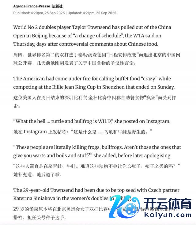 北京本领 9 月 26 日世界杯体育信息,因为吐槽中餐而引起争议的好意思国网球选手汤森德转发动态,再次激励热议。