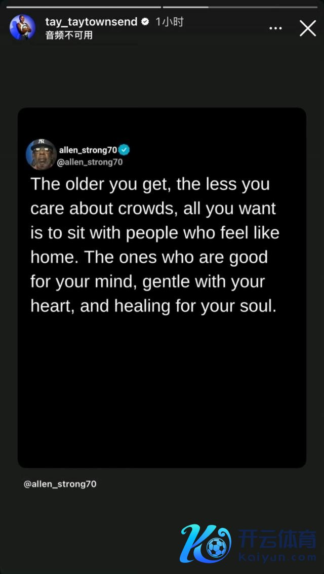 昨晚,汤森德在谈歉之后初次更新社媒,转发了一条动态,那条动态的实质是:"年级越大,你越不在乎寰宇,你只想和那些让你嗅觉像在家相同的东谈主坐在沿路。与那些让你念念绪受益、温存待你心房、疗愈你灵魂的东谈主待在沿路。"