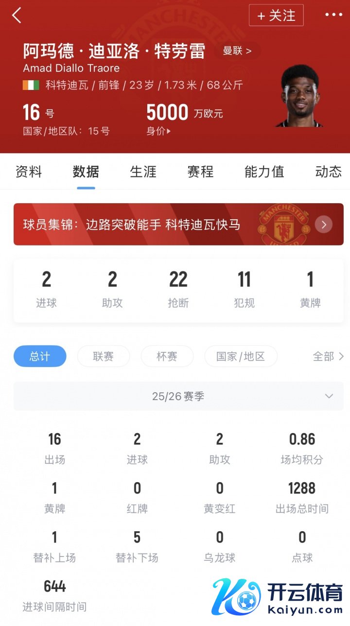 阿玛德在非洲杯出战的4场比赛里孝敬3球1助攻,惟有对阵加蓬莫得进球,而对阵加蓬的比赛里他在第76分钟才被换上场,出战工夫有限。