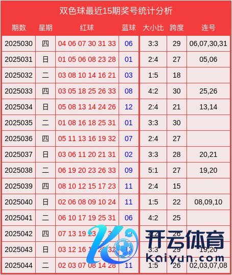上期回归:双色球2025044期开出奖号:红球02、03、07、08、14、28体育集锦,蓝球11。 当期红球大小比为1:5,跨度为26,开出2组连号02,03,07,08 最近15期双色球红球走势分析: 大小比分析:上期奖号的大小比为1:5,在近15期奖号数据中,少量最为火热,本期瞻望大小发达平衡,参考大小比为3:3。 跨度分析:上期奖号跨度为26,近15期跨度的奇偶比为5:5,大少量跨度发达平衡。本期参考奇数跨度23。 连码分析:上期奖号开出2组连号02,03,07,08,近15期开出连码