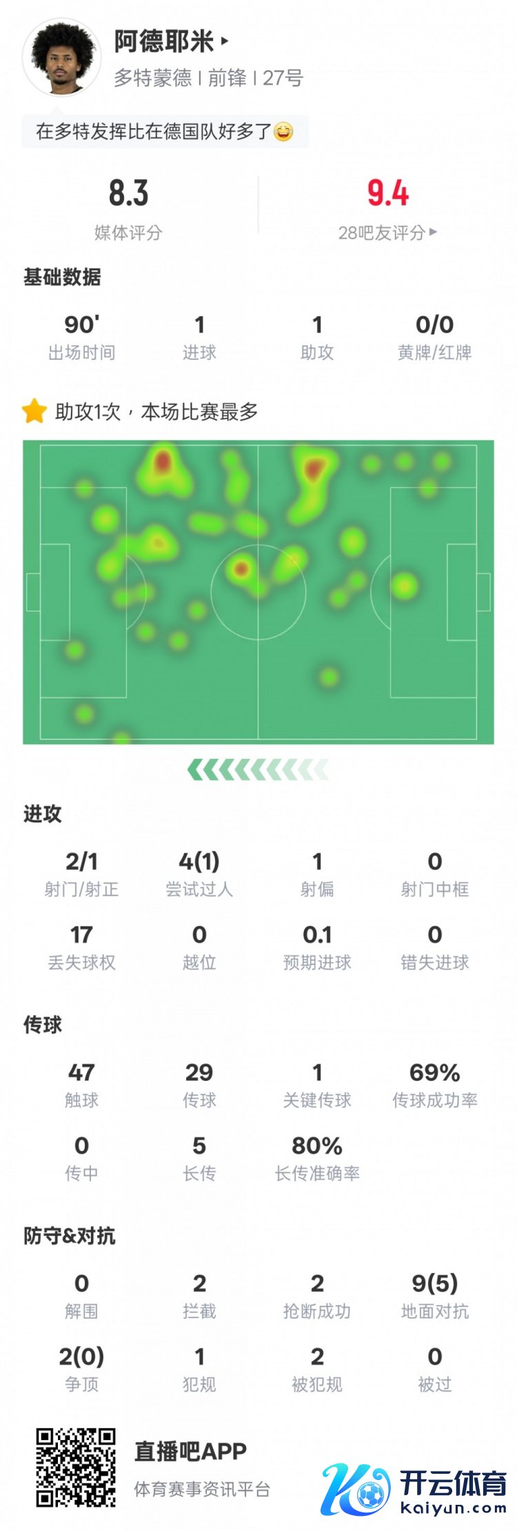 9月17日讯 欧冠联赛阶段第1轮,多特4-4尤文。阿德耶米首发出战,传射立功,还有1次过东说念主得手和1次要道传球,评分8.3。