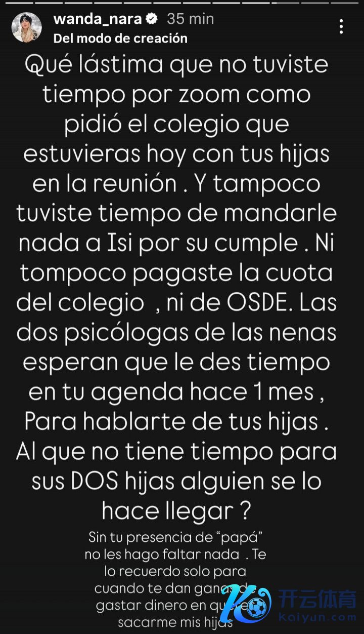 体育集锦 直播吧11月01日讯伊卡尔迪前妻旺达·娜拉绽开更新两条社媒社媒,月旦伊卡尔迪对待孩子的活动。 旺达:真可惜,你没能按学校条目干涉今天的线上家长会,和男儿们沿途通过Zoom(视频会议软件)参会。你也没技艺给伊西送任何诞辰礼物。学校的用度、医疗保障的用度你也齐没交。男儿们的两位热诚大夫一个月前就希望你能在日程中留出技艺,和她们聊聊你的男儿们。对我方的两个男儿齐没技艺的东说念主,需要有东说念主教导他吗?莫得你这个‘爸爸’的存在,我也不会让她们缺任何东西。我教导你,这仅仅为了退守你哪天思用钱