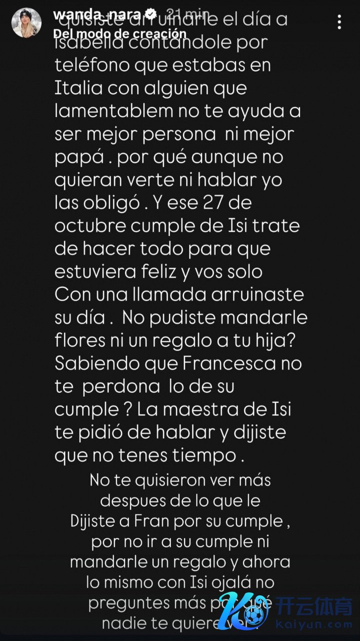 旺达:你思通过电话告诉伊莎贝拉你很缺憾留意大利和一个不可让你成为更好的东说念主、也不可让你成为更好爸爸的东说念主在沿途体育集锦,以此废弃她的一天。尽管她们不思见你、不思和你语言,我如故免强她们(和你干系)。10月27日伊西的诞辰,我致力让她沸腾,而你只打了一个电话就毁了她的一天。你就不可给你男儿送束花或一份礼物吗?你明知弗朗西斯卡还没海涵你没干涉她的诞辰、没送她礼物,当今对伊西又故技重施。希望你别再问为什么没东说念主思见你了。
