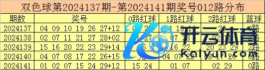 开奖精致:双色球第2024141期开出奖号:01 02 07 15 24 29 + 12。其中体育集锦,红球号码012路比为2:2:2,其中012路号码开出个数荒谬。蓝球号码为0路号码。