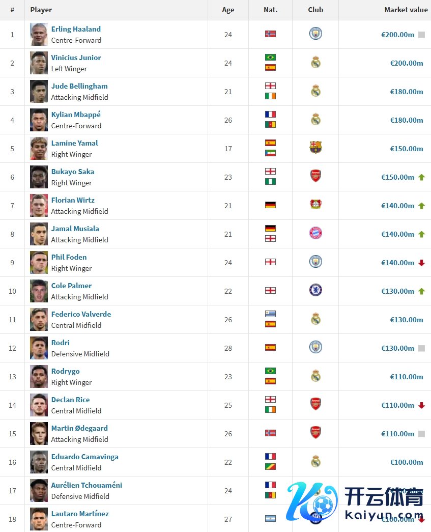 哈兰德、维尼修斯仍以2亿欧身价名次榜首,贝林厄姆、姆巴佩身价1.8亿欧紧随自后。