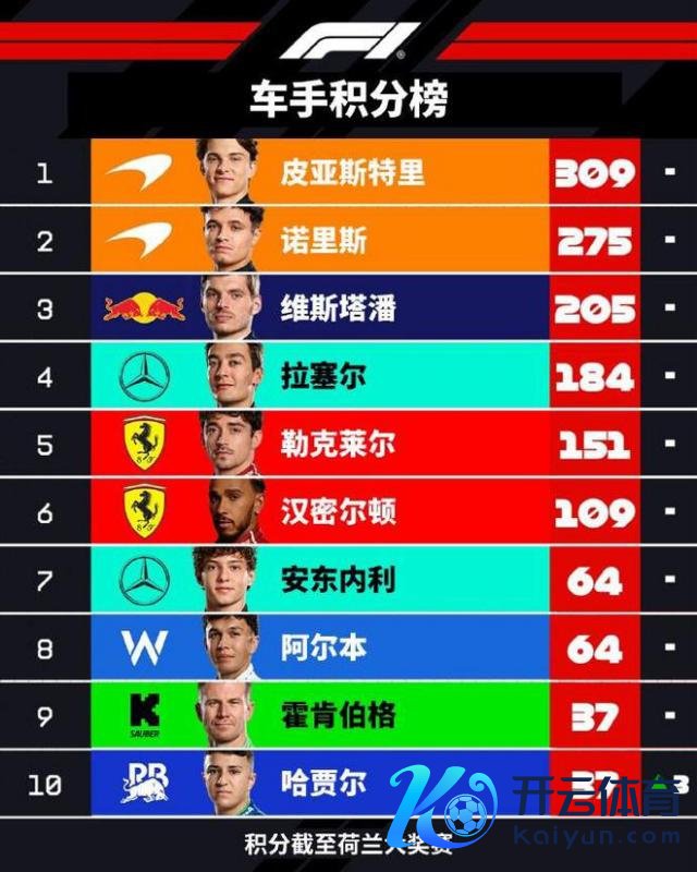 体育录像/图片 直播吧 9 月 1 日讯 F1 荷兰大奖赛法例沿途争夺,皮亚斯特里夺冠,哈贾尔生计首登领奖台,法拉利双车退赛,诺里斯退赛。 凭借本站夺冠,皮亚斯特里拉开了与队友诺里斯的差距,维斯塔潘不竭名挨次三。 F1 车手积分榜如下 1- 皮亚斯特里 309 2- 诺里斯 275 3- 维斯塔潘 205 4- 拉塞尔 184 5- 勒克莱尔 151 6- 汉密尔顿 109 7- 安东内利 64 8- 阿尔本 64 9- 霍肯伯格 37 10- 哈贾尔 37体育录像/图片