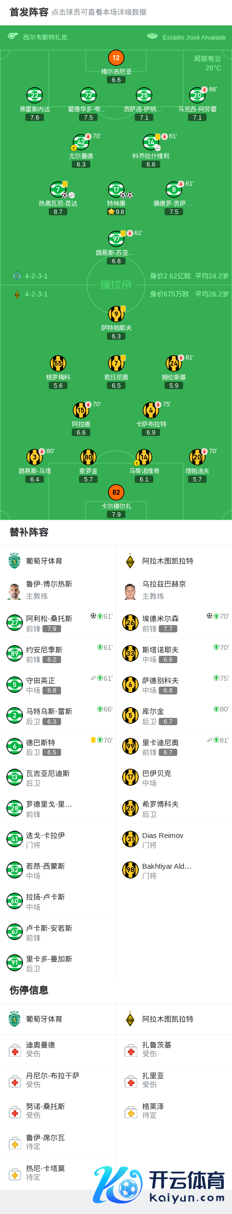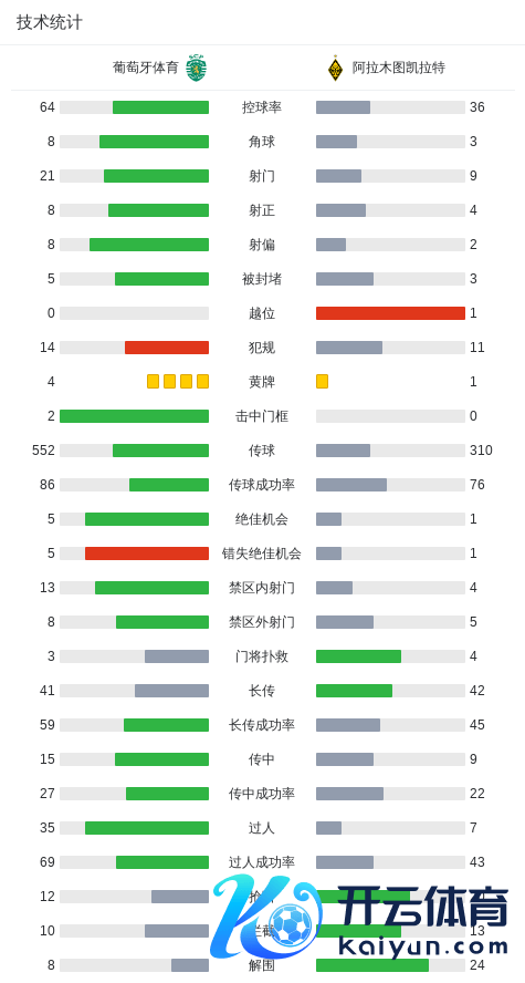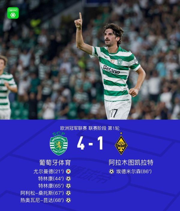 北京时候9月19日欧洲冠军联赛 联赛阶段 第1轮,葡萄牙体育对阵阿拉木图凯拉特。葡萄牙体育特林康梅开二度,阿利松-桑托斯破门,热奥瓦尼-昆达破门。阿拉木图凯拉特埃德米尔森破门。最终比分葡萄牙体育 4-1 阿拉木图凯拉特。 关节事件 第21分钟,苏亚雷斯造点,尤尔曼德点射罚丢 第43分钟,特林康禁区外寰宇波远射破门,葡体1-0阿拉木图凯拉特 第65分钟,特林康禁区推射远角梅开二度,葡体2-0扩大比分 第67分钟,桑托斯禁区外远射破门,葡体3-0阿拉木图凯拉特 第68分钟,昆达禁区勾通过东说念主兜
