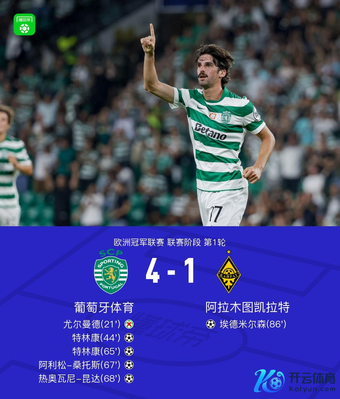 北京时候9月19日欧洲冠军联赛 联赛阶段 第1轮,葡萄牙体育对阵阿拉木图凯拉特。葡萄牙体育特林康梅开二度,阿利松-桑托斯破门,热奥瓦尼-昆达破门。阿拉木图凯拉特埃德米尔森破门。最终比分葡萄牙体育 4-1 阿拉木图凯拉特。