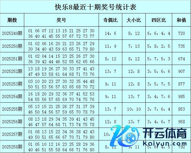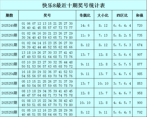 福彩快意8第2025258期开奖回来:01 05 10 12 16 23 25 28 29 36 40 46 51 55 58 64 66 71 76 80,其中奖号四区比为5:6:4:5,奇偶比比为8:12,大小比为9:11,和值为792。