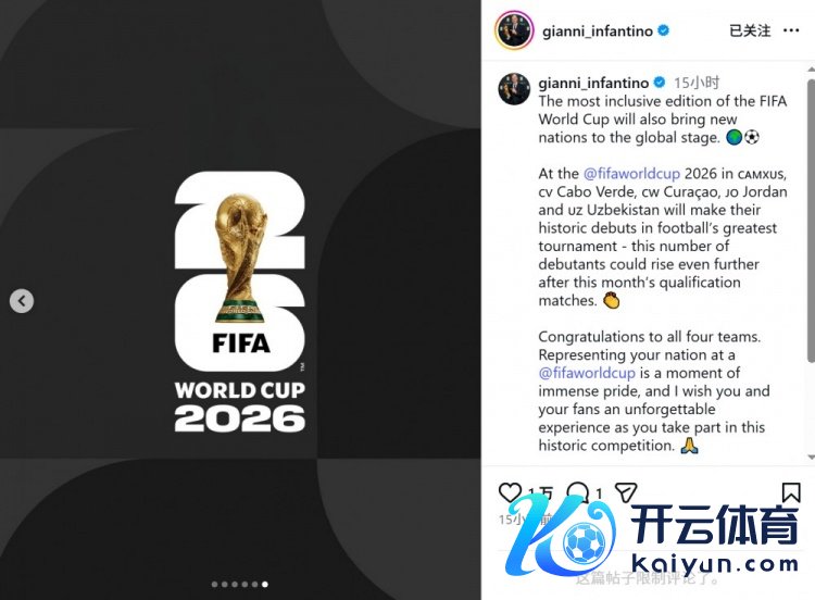 3月12日讯 海外足联主席因凡蒂诺社媒发文,对行将初度亮相宇宙杯的国度队暗示道贺。 “最具包容性的一届宇宙杯将让更多国度登上宇宙舞台。在加拿大、墨西哥和好意思国联结举办的2026年宇宙杯上, 佛得角、库拉索、约旦和乌兹别克斯坦将历史性地初度在这项最伟大的足球赛事中亮相,跟着本月预选赛的进行,新晋参赛国数目可能不息增多。 谨向四支球队致以道贺体育录像/图片,代表故国建设宇宙杯是无比荣耀的时辰,愿你们与球迷们在这场历史性赛事中成绩一段记起的履历。”