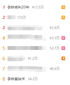 现在在微博热搜榜,“李铁被判20年”话题热度412.5万位列第一位体育录像/图片,“李铁案始末”话题热度34.2万排在第8位。