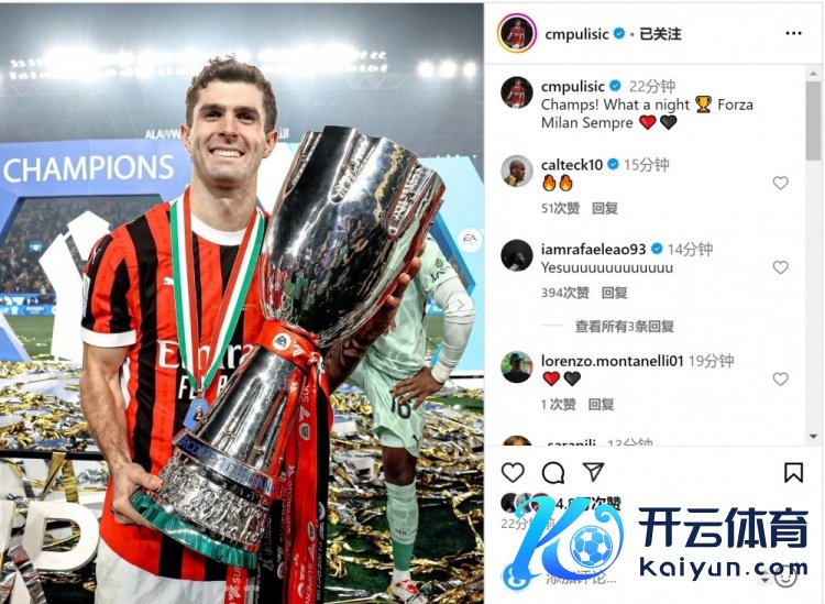 普利西奇赛后在酬酢媒体上晒出与奖杯的合照,配文:“冠军!何等深邃的夜晚🏆加油米兰,永远❤️🖤”