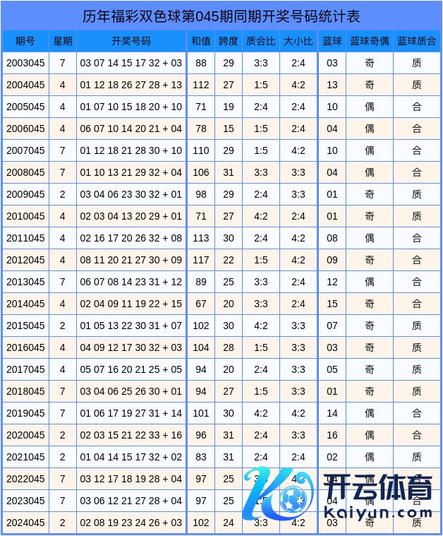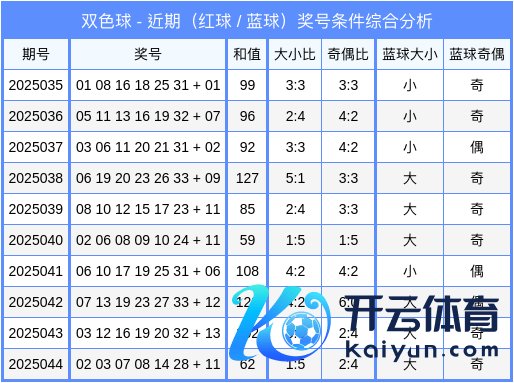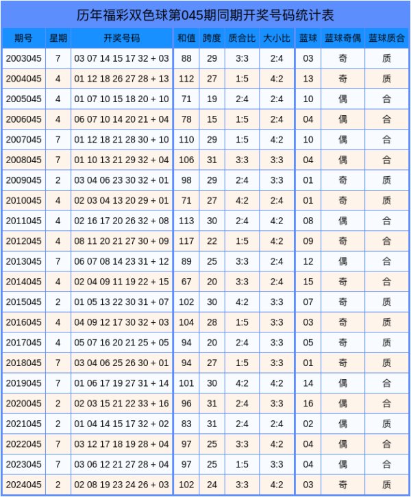 第2025044期福彩双色球开奖号码为:02、03、07、08、14、28+11;体育赛事直播 红球奖号的大小比为1:5,质合比为3:3,跨度为26,和值为62;蓝球奖号则是开出大数+奇数。 双色球积年第045期奖号数据分析统计 大小比分析:去年同时红球奖号的大小比为3:3,大数奖号较热,在积年同时奖号数据中大小比为66:66,大一丝码均匀下号,本期预测大小比为2:4,谛视一丝热出。 质合比分析:去年同时红球奖号的质合比为1:5,质数、合数号码平均出号,在积年同时奖号数据中质合比为49:83,
