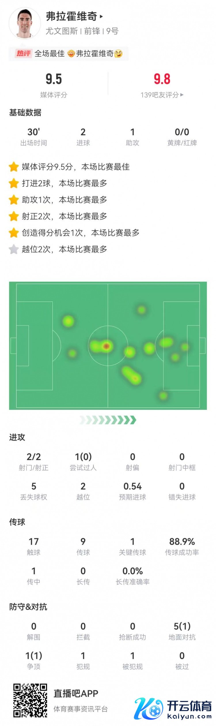 体育赛事直播 9月17日讯 尤文在本轮欧冠4-4战平多特,弗拉霍维奇本场数据如下: 替补出战30分钟 2球 预期进球0.54 1助攻 预期助攻0.16 2射门、2射正 1过东说念主、0得手 17触球 9传球、8得手 1要道传球 1传中、1得手 1创造要紧契机 6叛逆、2得手 5丢失球权 1犯规 1造犯规 2越位 获评9.5分全场最高体育赛事直播