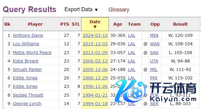 把柄数据统计,斯玛特此役7次抢断,这是队史近29年里的最多。最近29年还作念到过单场7抢断的湖东说念主球员有浓眉、路威、慈世平、科比、斯马什-帕克和埃迪-琼斯。