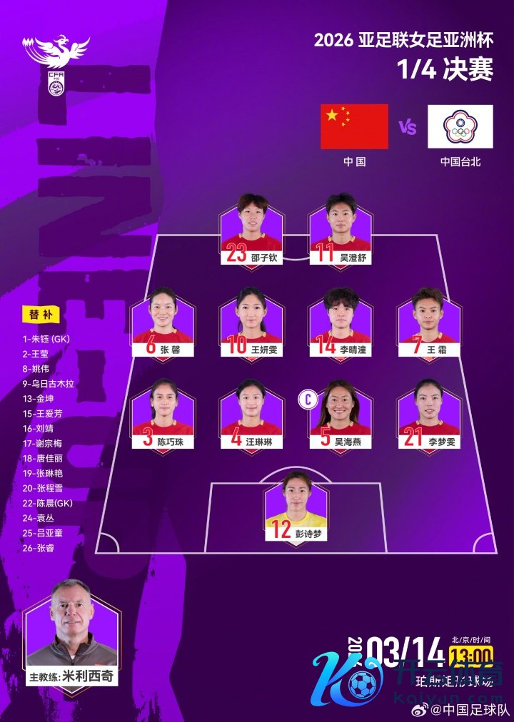 2026亚足联女足亚洲杯 1/4决赛,中国队VS中国台北队。中国队首发威望出炉! 体育赛事直播