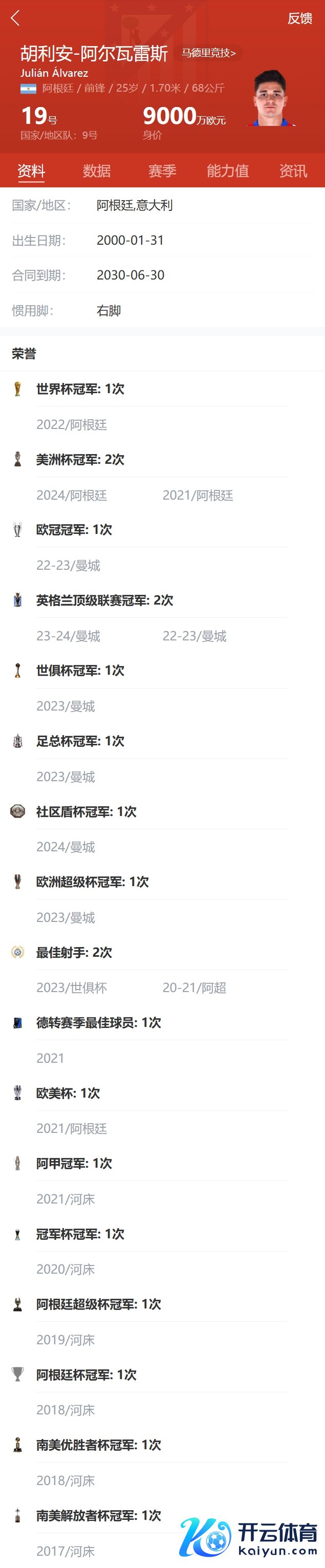 这对马竞先锋阿尔瓦雷斯来说大约有着更多预见。混名“小蜘蛛”的他自出说念以来就有着足够的“冠军命”,在25岁前,阿尔瓦雷斯就仍是包揽天下杯、欧冠、英超、南好意思目田者杯、世俱杯、足总杯等其他球员终身追求的荣誉。