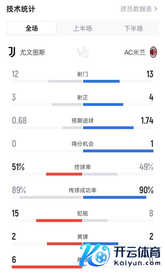 全场比赛数据如下:射门12-13射正3-4预期进球0.68-1.74进球契机0-1控球率51%-49%传球告捷率89%-90%犯规15-8黄牌2-2角球6-0 体育赛事直播